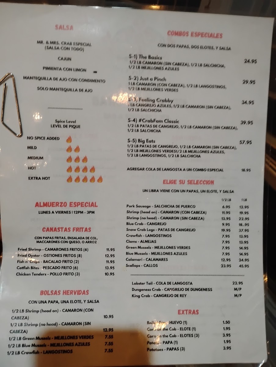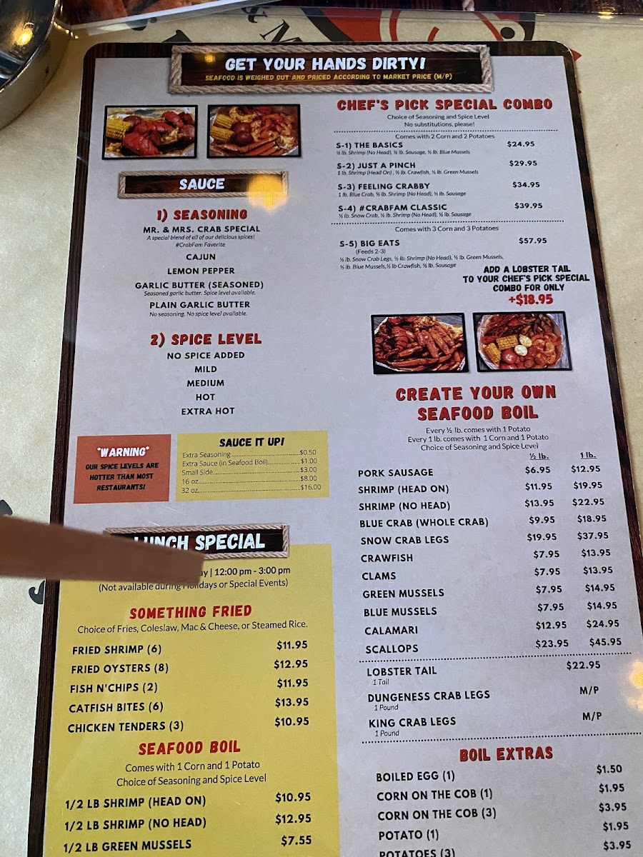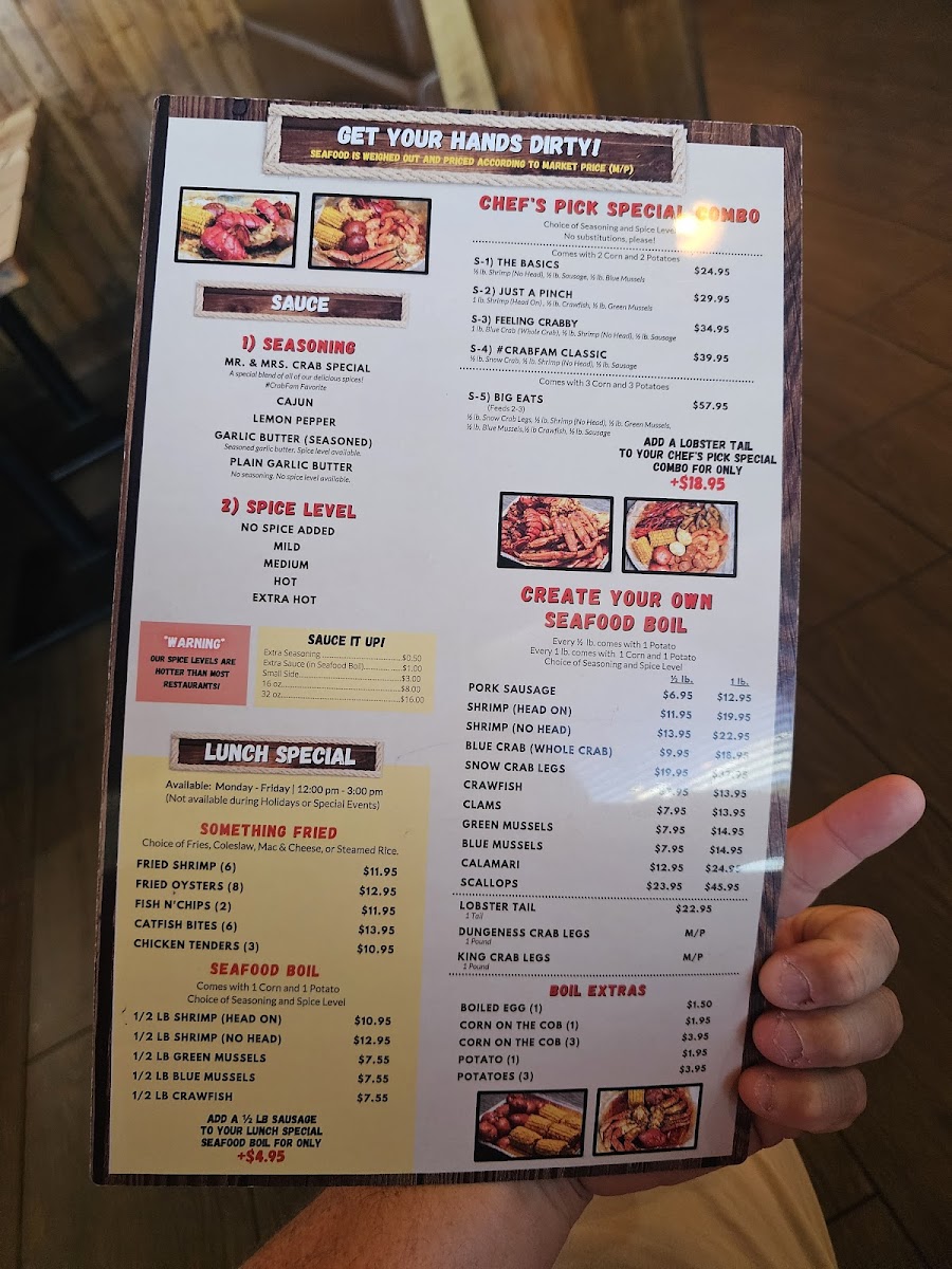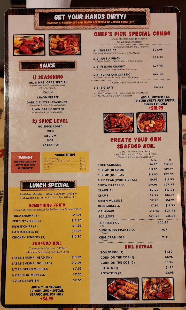 1/2 lb Snow Crab, 1/2 lb Shrimp (no head), 1/2 lb Sausage