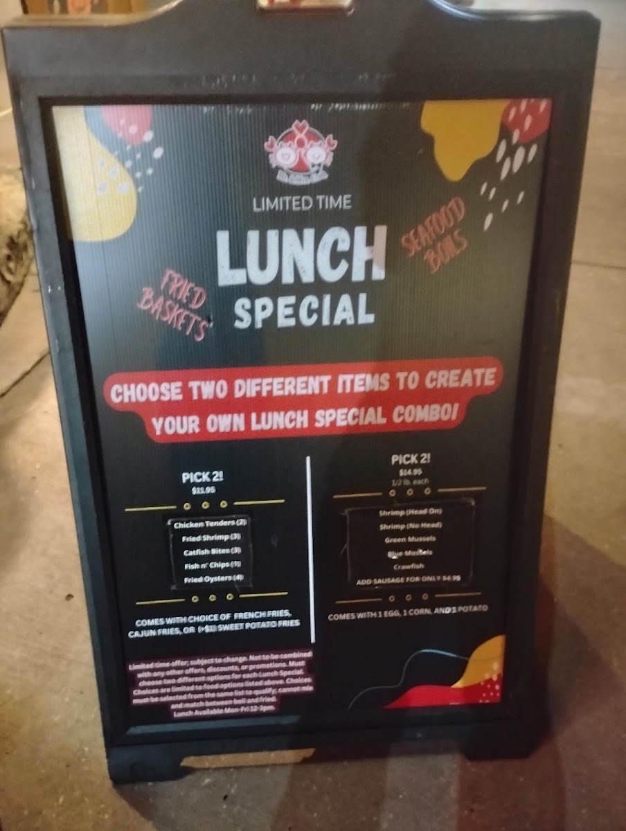 1/2 lb Shrimp (no head), 1/2 lb Sausage, 1/2 lb Blue Mussels